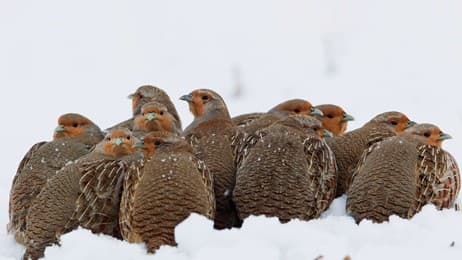 Eine Schar Rebhühner kuschelt sich im Schnee zusammen, um sich zu wärmen (© Duncan Usher/Minden Pictures)