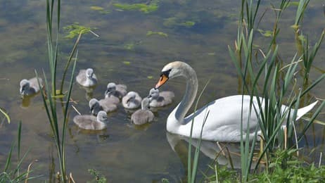 Schwan mit Küken, Aischgrund, Franken, Bayern (© Rüdiger Hess/geo-select FotoArt)