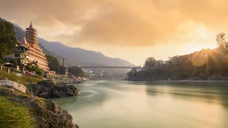 Ganga river, Lakshman Jhula, and Tera Manzil Temple in Rishikesh, India (© Travelwild/Shutterstock)