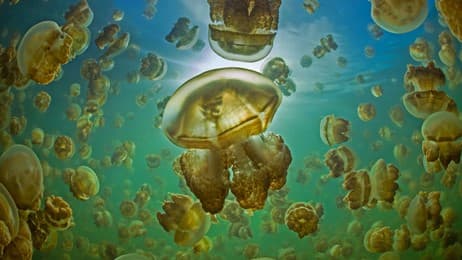 Golden jellyfish in Jellyfish Lake on the island of Eil Malk, Palau (© Nature Picture Library/Alamy)