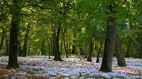Soleil traversant les arbres d’une forêt tapissée de cyclamens roses et blancs en Bretagne (© Rosemary Calvert/Getty Images)