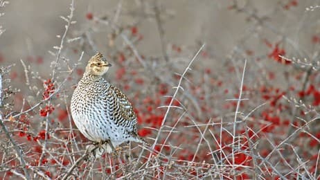 A sharp-tailed grouse (tympanuchus phasianellus) perched on a buffalo berry shrub in Elbow, Sask. (© Nick Saunders/Getty Images)