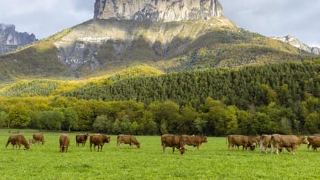 Des vaches devant le Mont Aiguille, Parc Naturel Régional du Vercors, Isère, France (© Jakub Połomski/Offset)