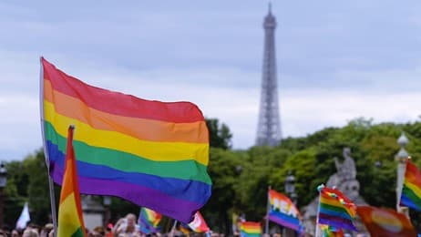 Drapeau arc-en-ciel flottant près de la Tour Eiffel lors de la Marche des fiertés de Paris (© Aflo Co. Ltd./Alamy Stock Photo)