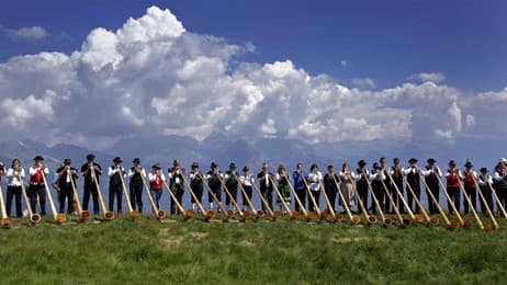 Alphorn musicians perform during the International Alphorn Festival in Nendaz, Switzerland (© Fabrice Coffrini/Getty Images)