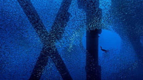A Brandt's cormorant hunts for a meal in a school of Pacific mackerel beneath an oil rig off the coast of Los Angeles, California (© Alex Mustard/Minden Pictures)
