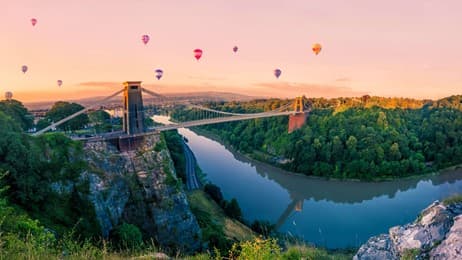 Hot air balloons over Clifton Suspension Bridge at sunrise, Bristol (© Rich Jones Photography/Getty Images)