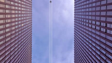 A photo of a plane above 2 buildings that works well on foldable and dual screen devices