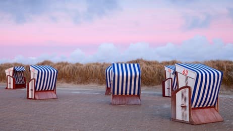 Strandkörbe im Abendrot am Nordstrand der Insel Borkum, Niedersachsen (© DEEPOL by plainpicture/Wilfried Wirth)