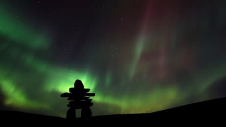 Inukshuk silhouetted against the Northern Lights in Barren Lands, Northwest Territories, Canada (© Mark Duffy/Alamy)