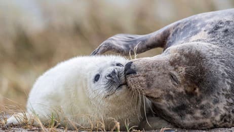 Maman phoque gris et son petit sur une plage d’Heligoland, Schleswig-Holstein, Allemagne (© imageBROKER/Alamy Stock Photo)
