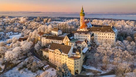 Winterliche Morgenstimmung am Kloster Andechs in Bayern mit Blick auf den Ammersee (© Reinhard Schmid/Huber/eStock Photo)