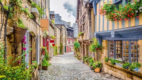 Rue du Petit-Fort et ses jardinières fleuries, Dinan, Côtes-d’Armor, Bretagne (© Scott Wilson/Alamy Stock Photo)