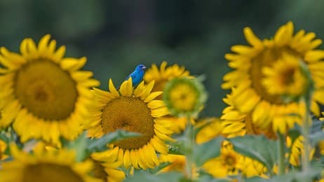 「ヒマワリに止まるルリノジコ」米国 (© William Krumpelman/Getty Images)