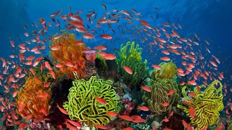 Ein Schwarm Juwelen-Fahnenbarsche in einem Korallenriff mit Haarsternen, Great Barrier Reef, Queensland, Australien (© Gary Bell/Minden Pictures)