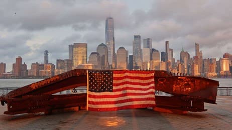 US flag on part of a 9/11 memorial overlooking the New York skyline from Exchange Place, Jersey City, New Jersey (© Gary Hershorn/Getty Images)