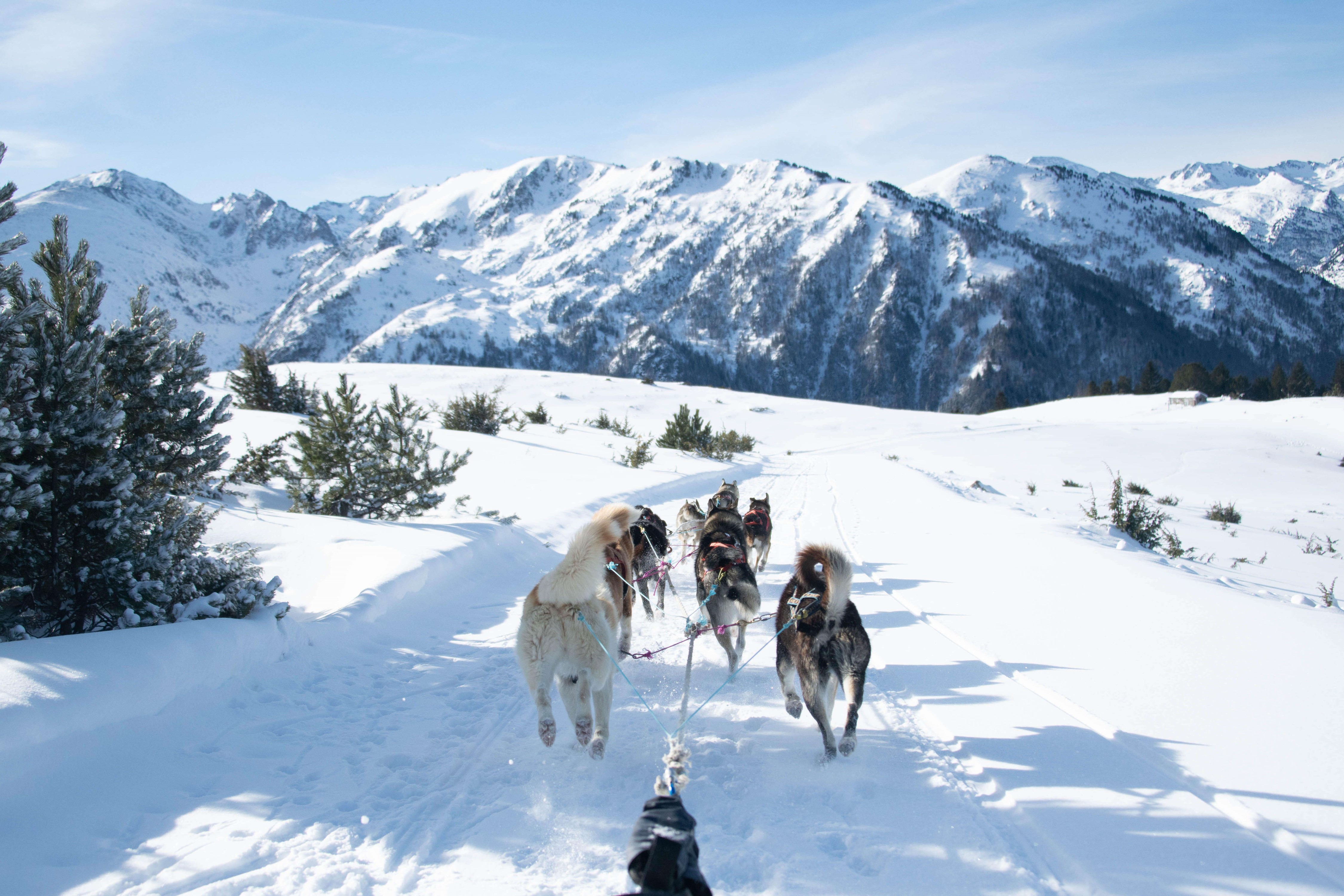Vue depuis un traîneau tiré par des chiens au milieux des montagnes, Les Cabannes, Occitanie, France (© Cavan Images/Alamy Stock Photo)