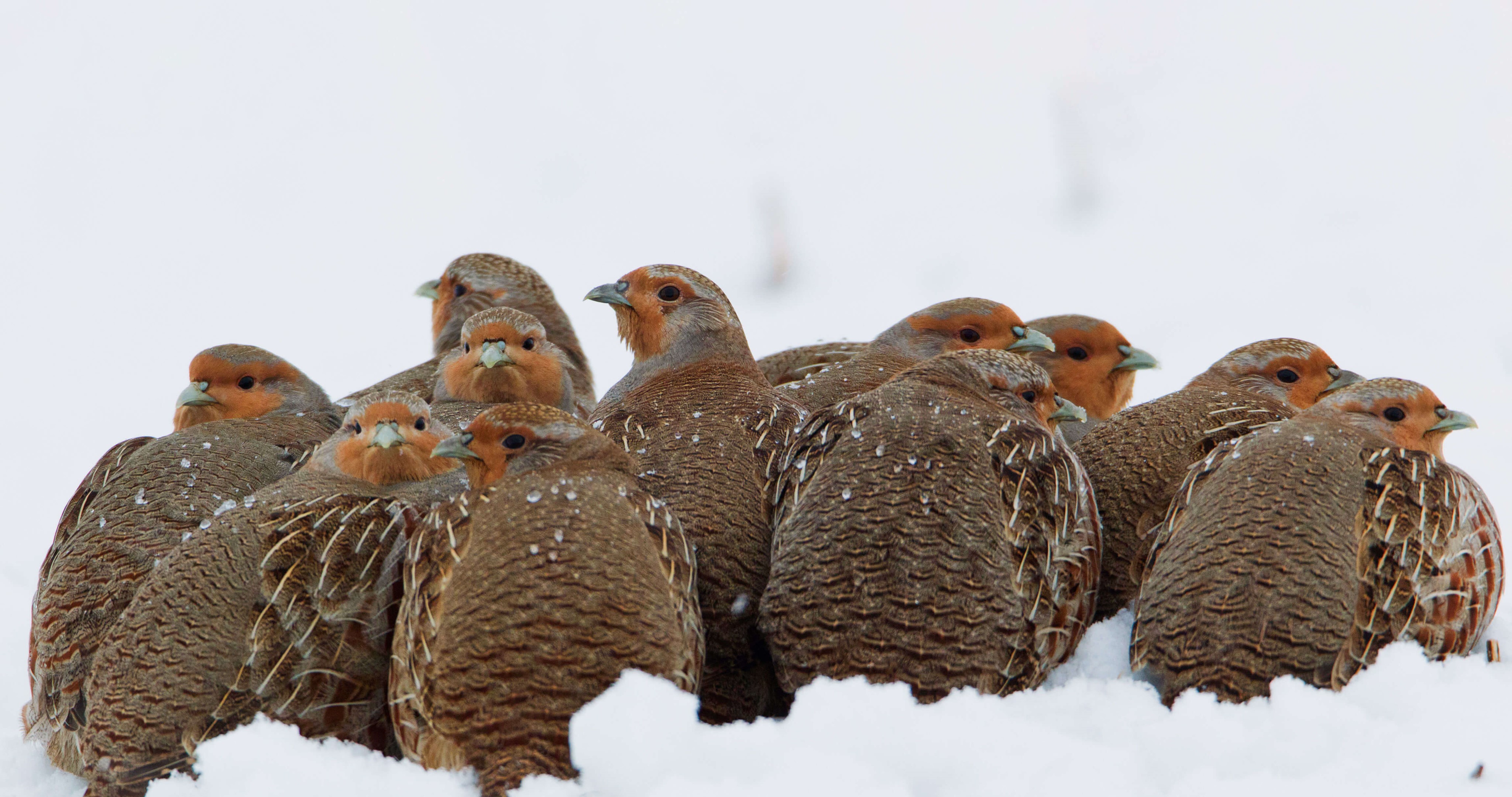 Eine Schar Rebhühner kuschelt sich im Schnee zusammen, um sich zu wärmen (© Duncan Usher/Minden Pictures)