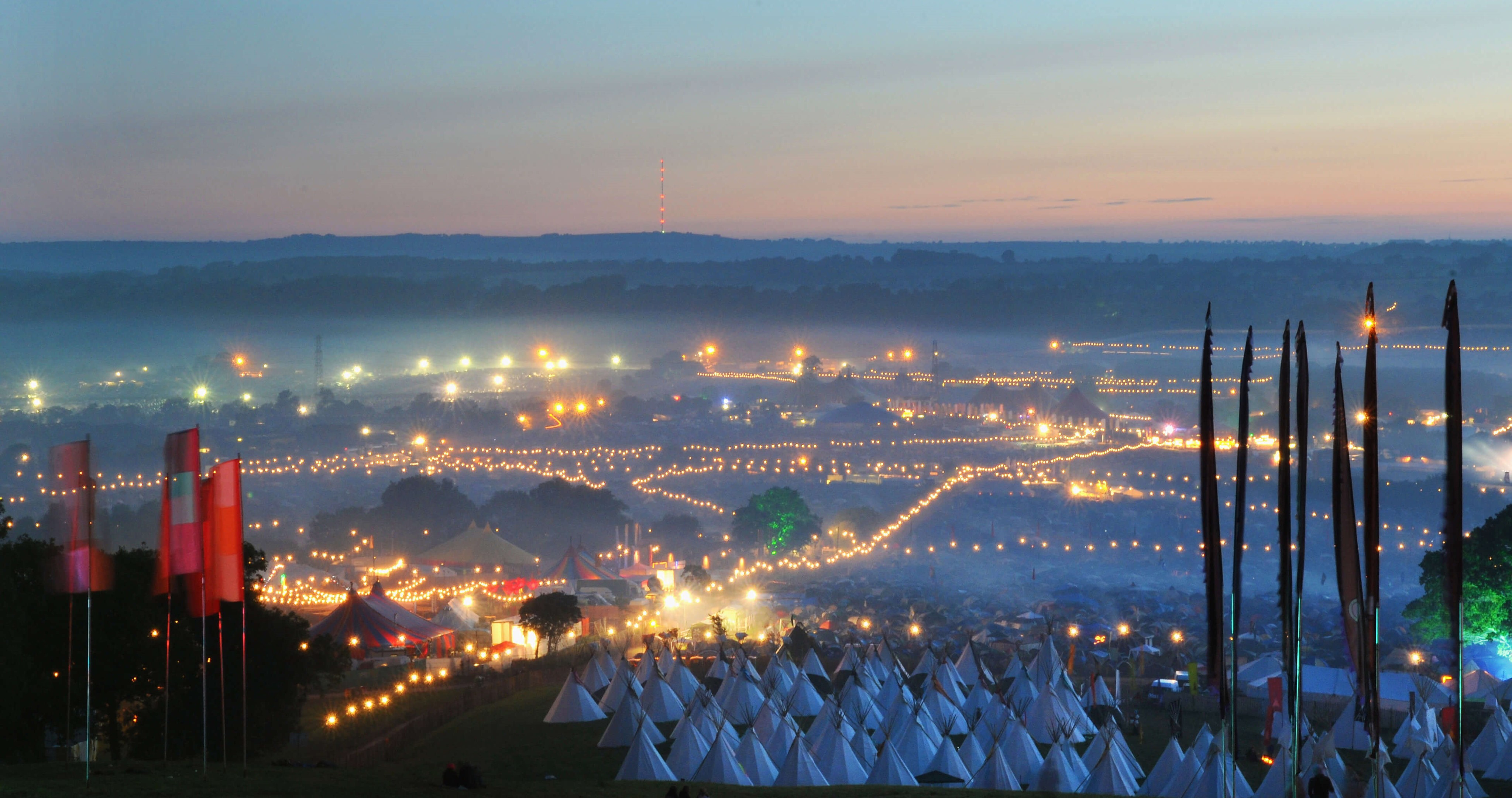 A view of the Glastonbury Festival site from Pennard Hill, Somerset at dawn, June 2009. (© Jim Dyson/Getty Images)
