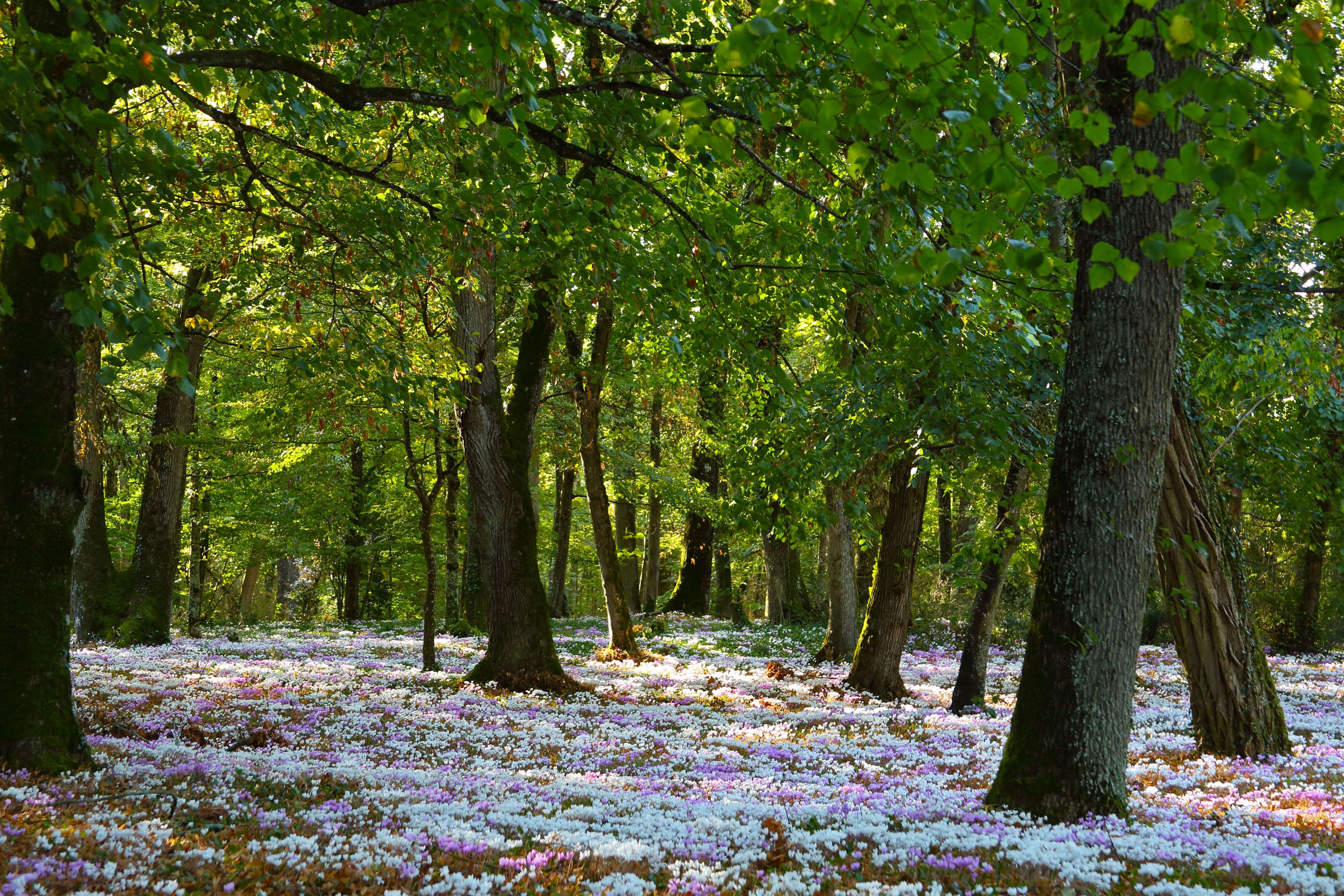 Soleil traversant les arbres d’une forêt tapissée de cyclamens roses et blancs en Bretagne (© Rosemary Calvert/Getty Images)