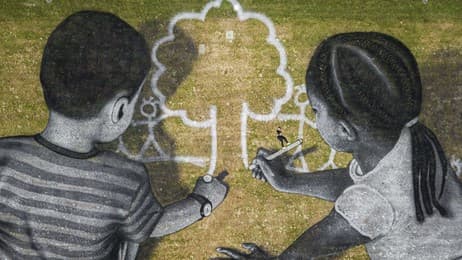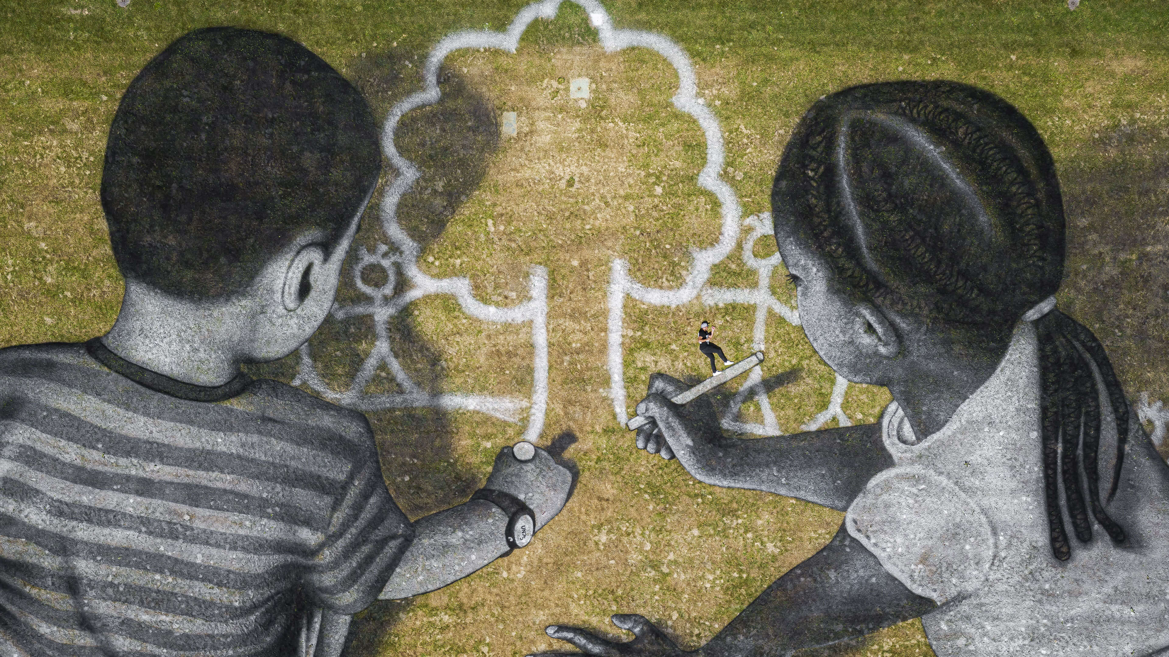 Artist Saype poses with his land art painting at UN Headquarters, Geneva, Switzerland (© Valentin Flauraud/EPA-EFE/Shutterstock)