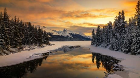 Scenic view of lake by snowcapped mountains in Banff, Alberta, Canada (© Herbert Rong/Getty Images)