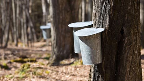 Buckets on maple trees collecting sap for maple syrup (© capecodphoto/Getty Images)