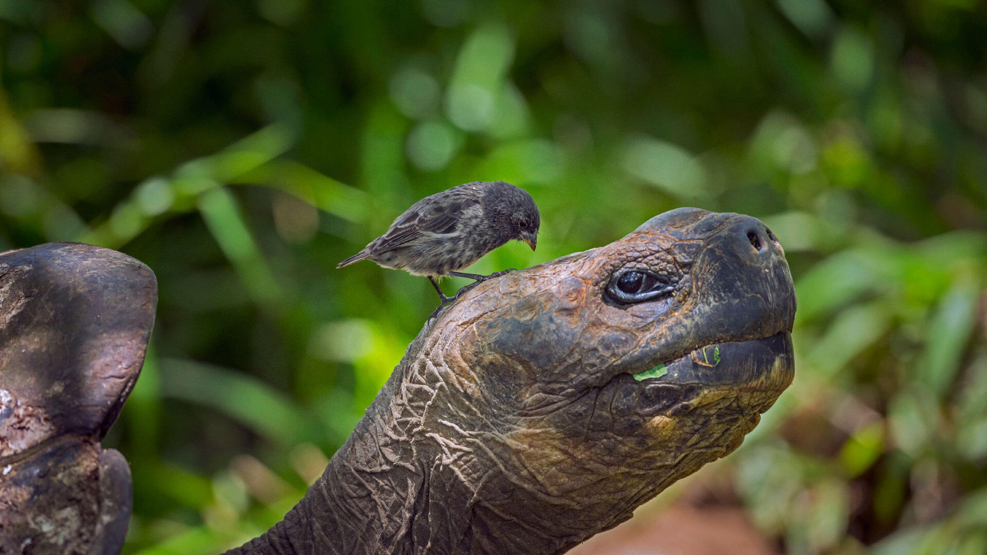 A Darwin's finch on a giant tortoise for the anniversary of 'On the Origin of Species' (© Tui De Roy/Minden Pictures)