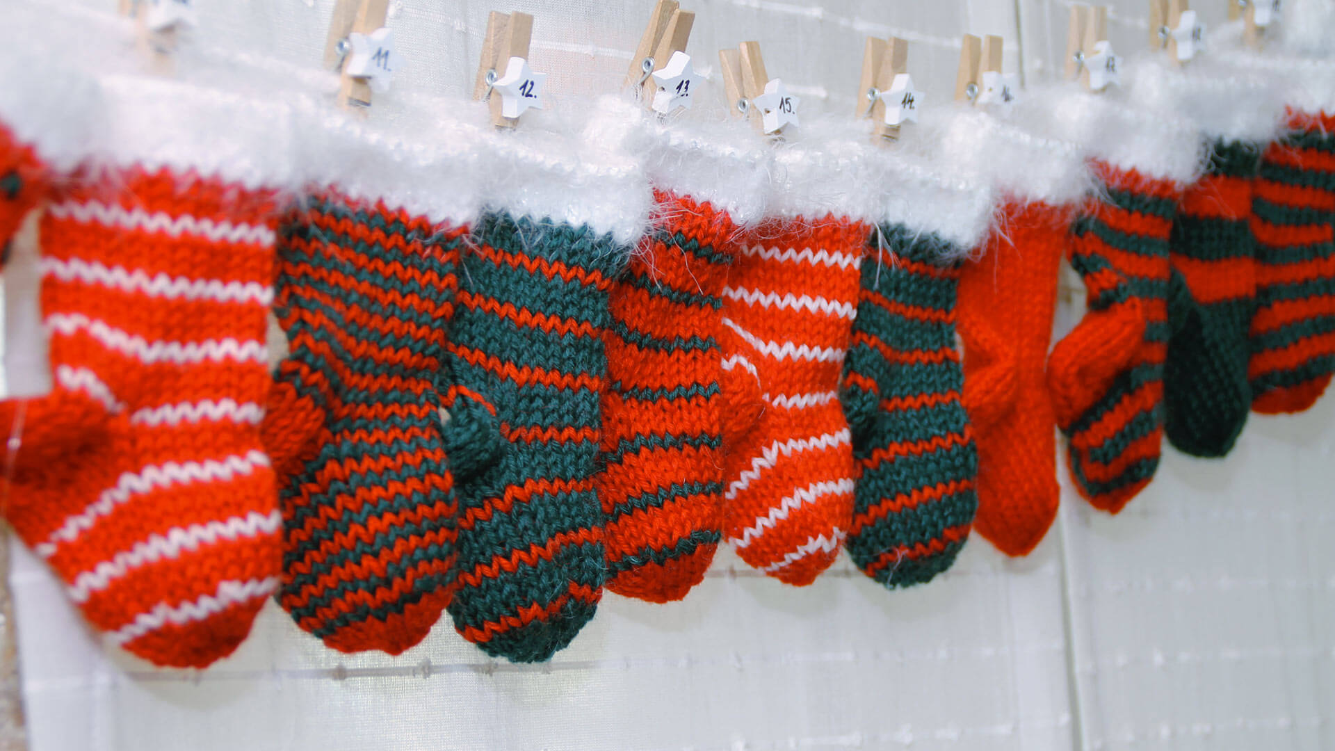 Un calendrier de l’Avent composé de petites chaussettes tricotées (© Zoonar GmbH/Alamy Stock Photo)
