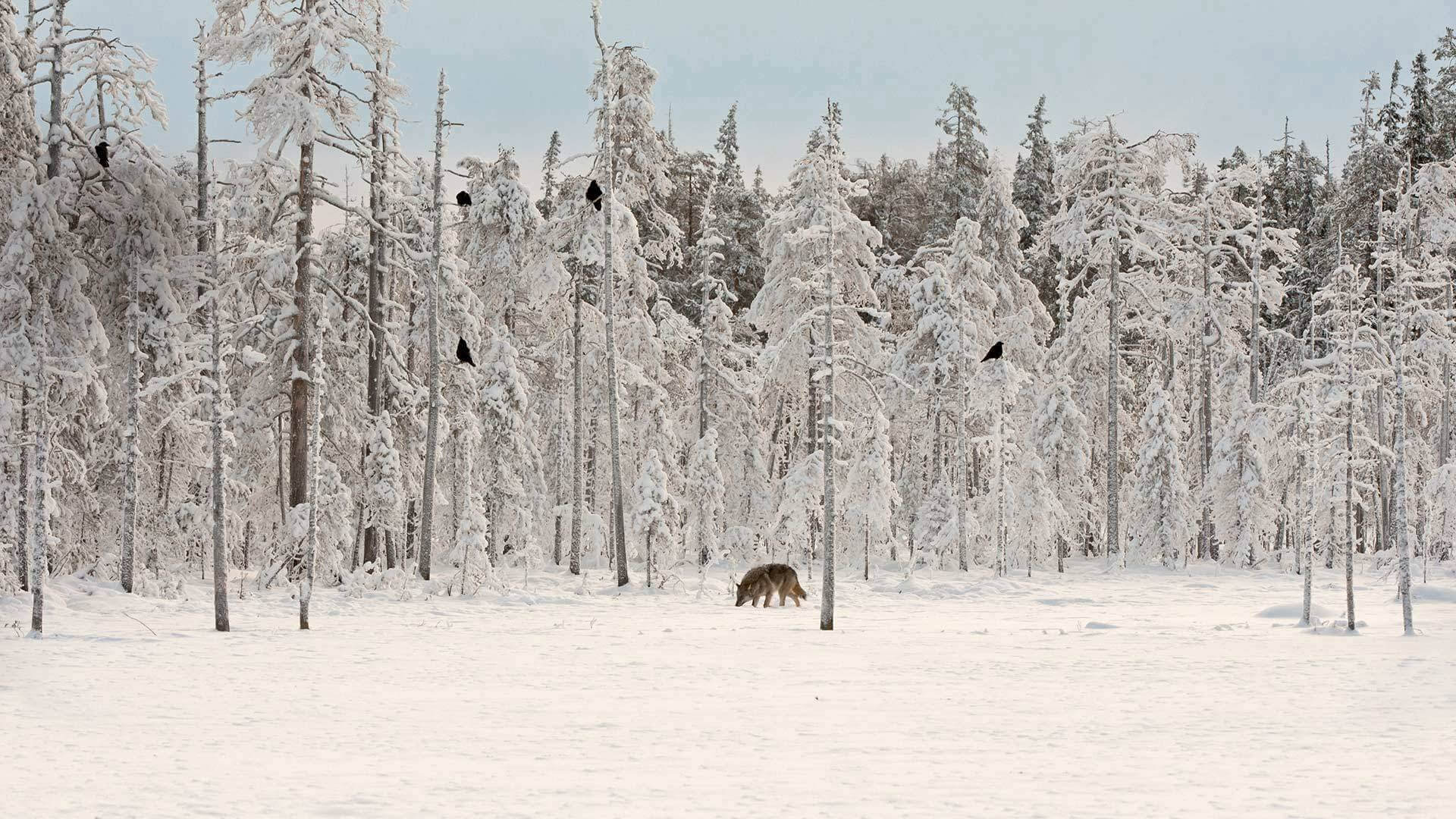 Un loup gris entouré de corbeaux, Finlande (© Lassi Rautiainen/Minden Pictures)