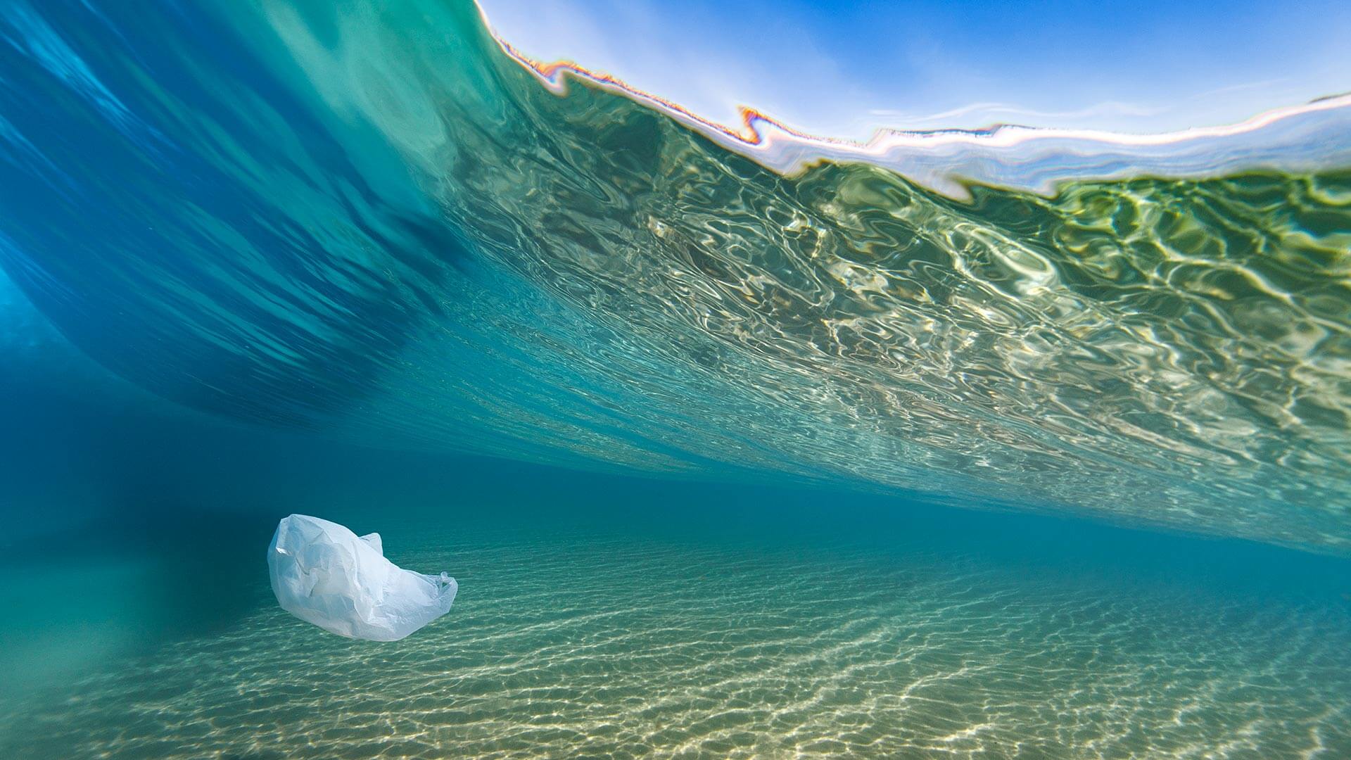 A plastic bag hovers underneath a breaking wave at the beach (© lindsay_imagery/iStock/Getty Images Plus)