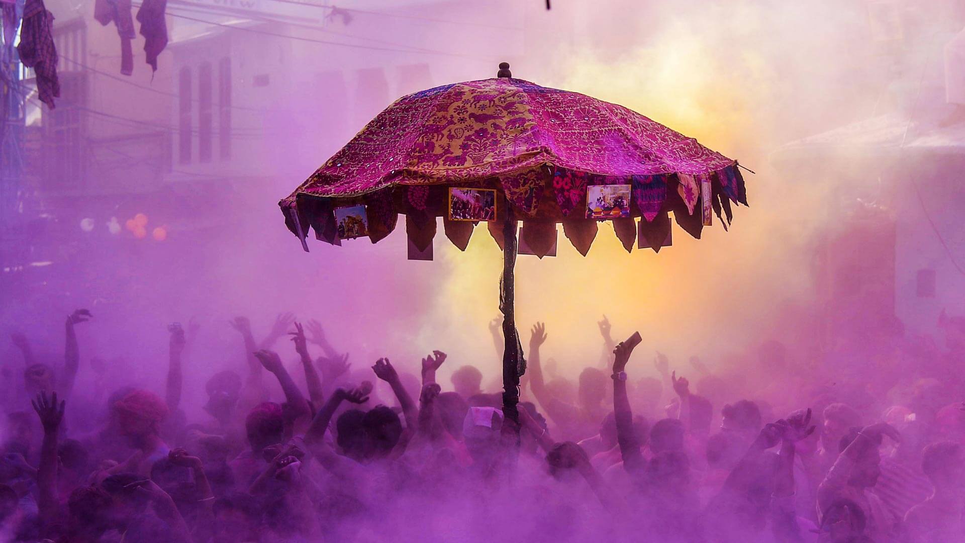 Devotees and foreign tourists partaking in 'kapda-phaar' during Holi celebrations. (© SHAUKAT AHMED/AFP/Getty Images)