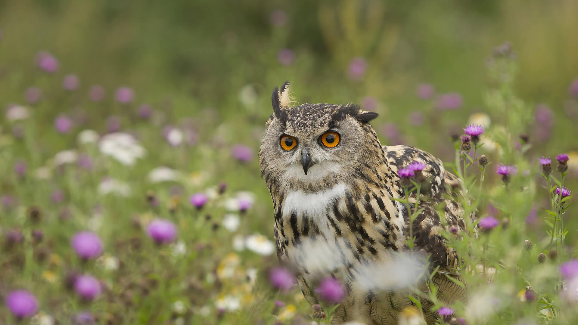 Eurasian Eagle-Owl (Bubo bubo) in wildflower meadow, Rhineland-Palatinate, Germany (© Rosl Roessner/Minden Pictures)