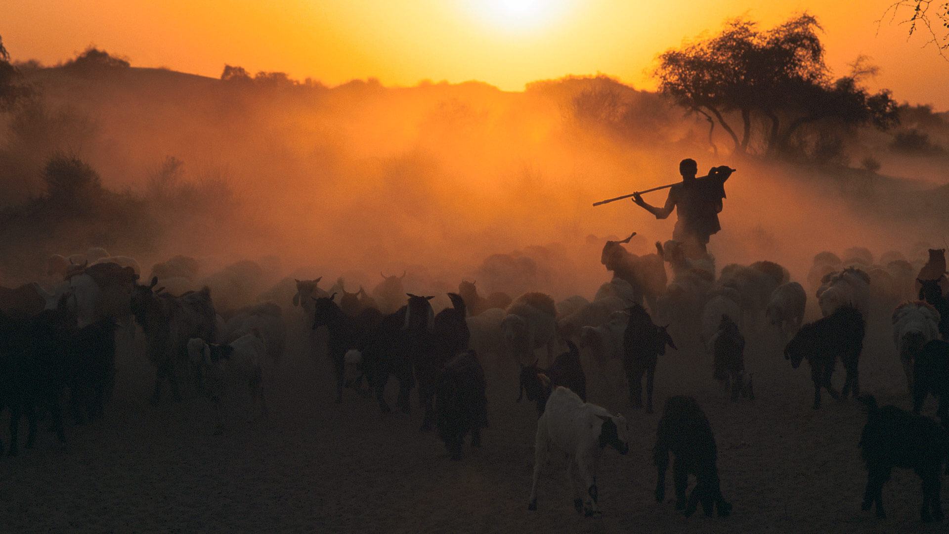 Shepherd with flock of sheep at dawn, Thar desert (© Laurent Geslin/Minden Pictures)