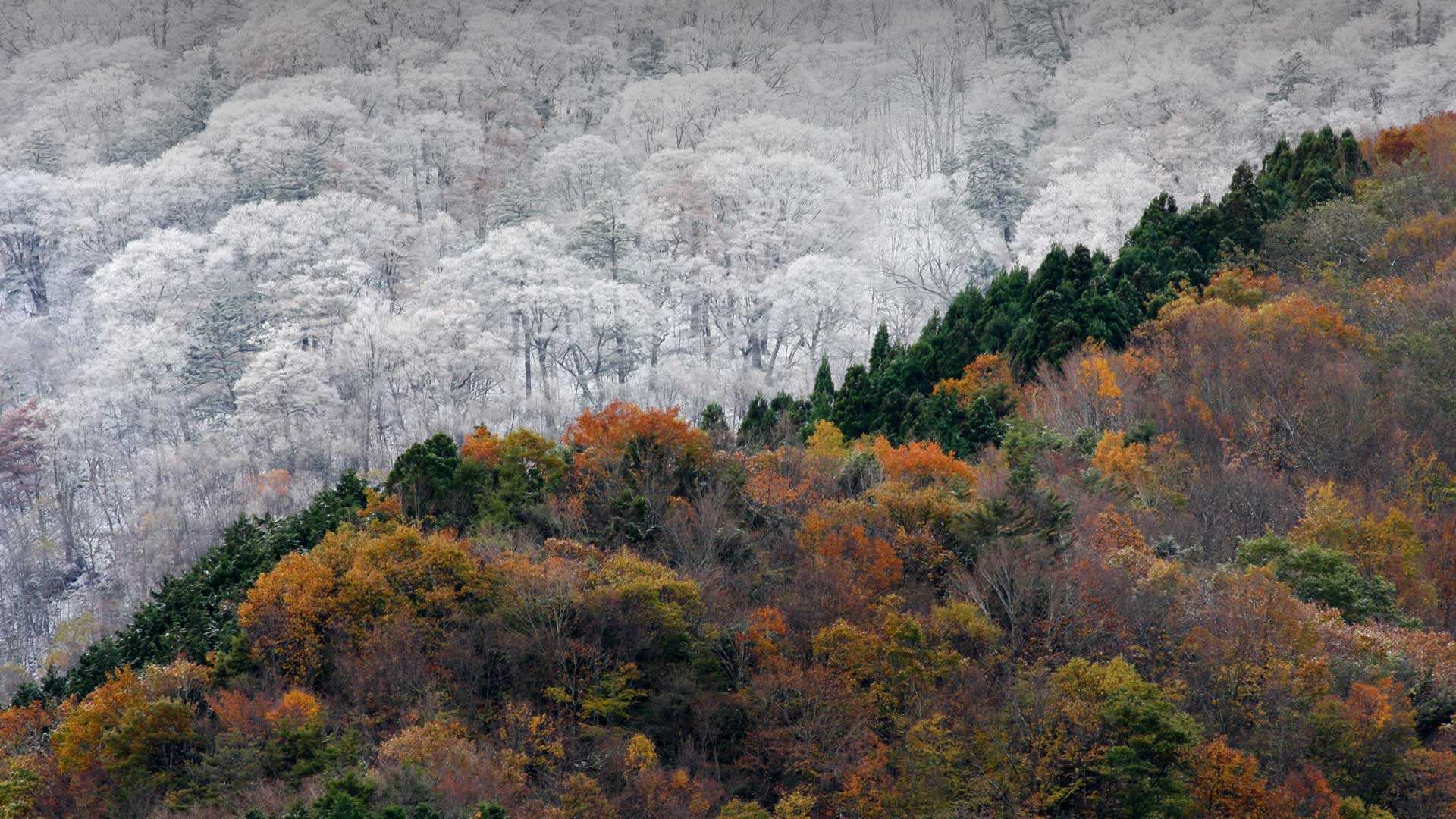 Vorsaisonaler Schneefall trifft auf die letzten Herbstfarben, Japan (© SpontaneousPictures/iStock/Getty Images Plus)