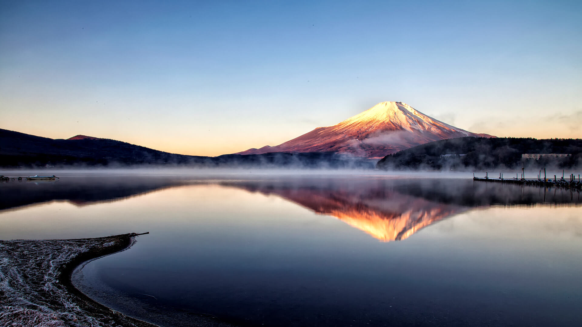 「山中湖から見た富士山の朝焼け」山梨県 (© Nyoman Sundra/GettyImages)