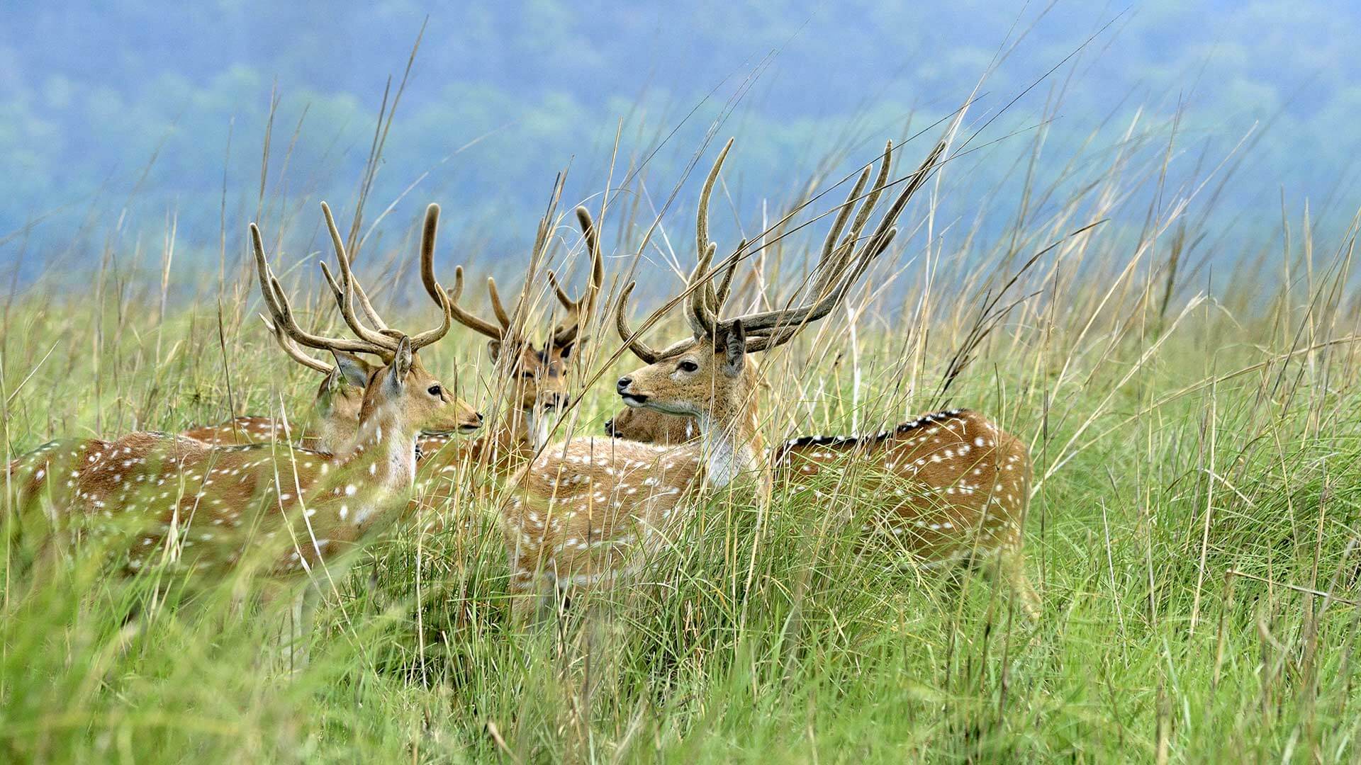 Five adult deer in the grasslands at Jim Corbett National Park, Uttarakhand (© FLPA/Alamy Stock Photo)