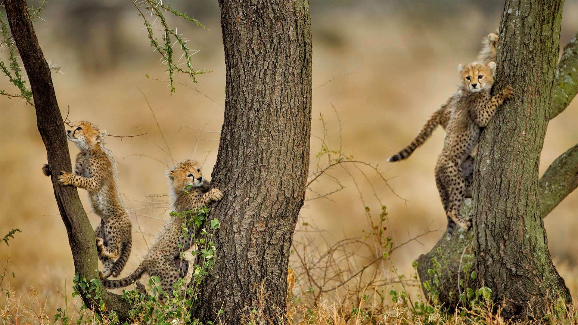 Cheetah cubs climbing acacia trees in Ngorongoro Conservation Area, Tanzania (© Paul Souders/Getty Images)