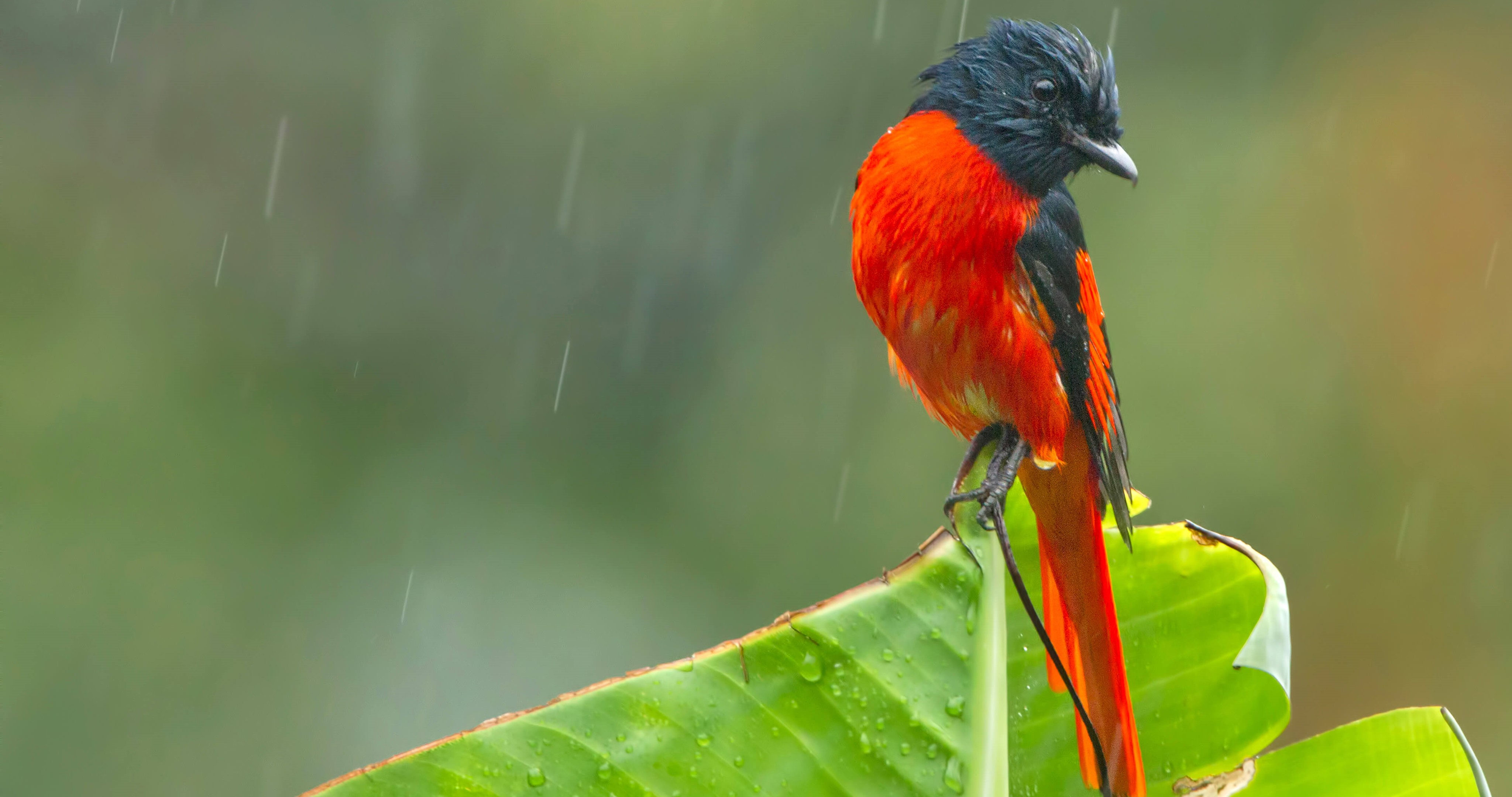 A scarlet Minivet during rainfall, West Bengal (© Debapratim Saha/Minden Pictures)
