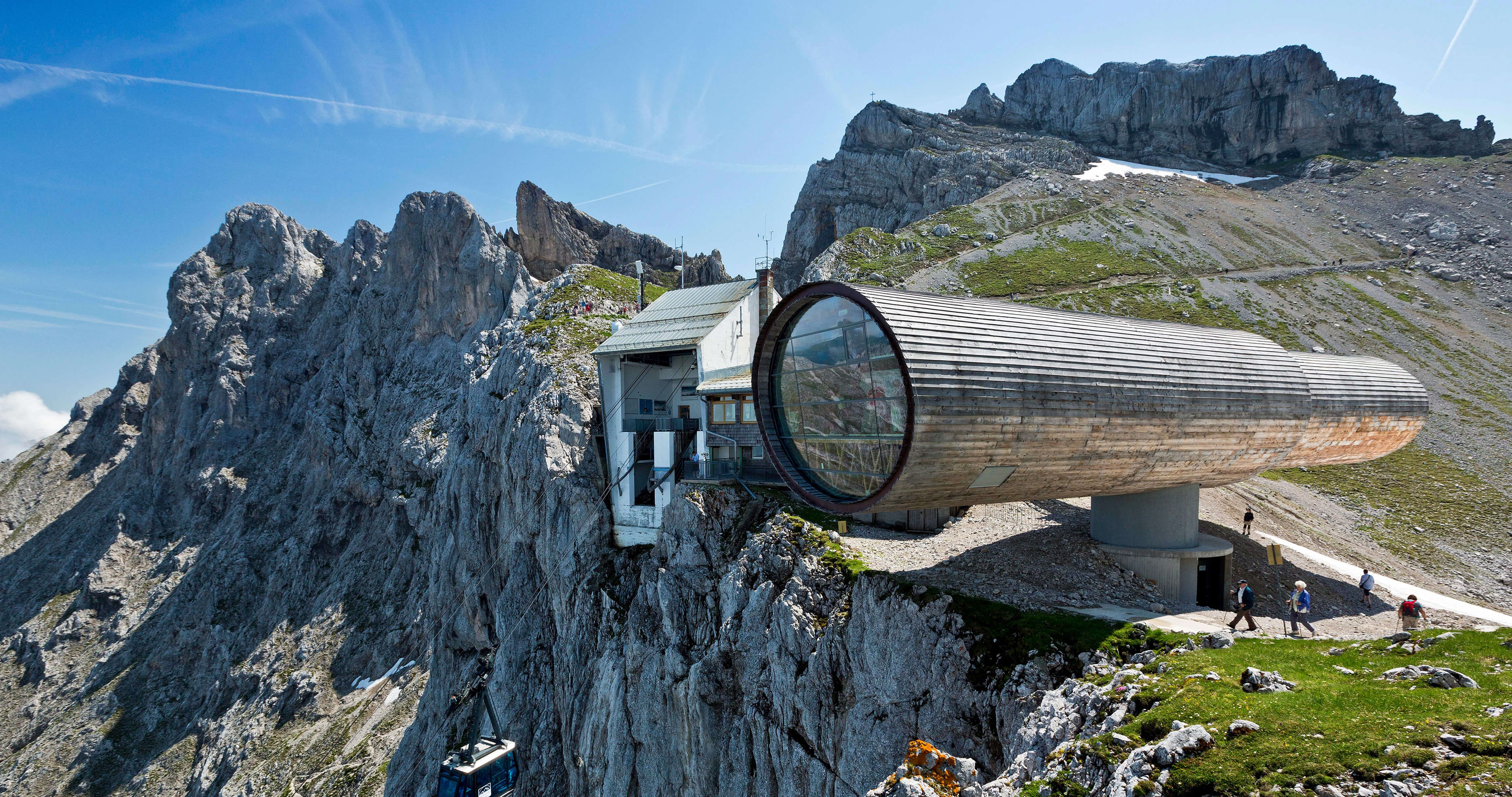 Natur-Informationszentrum Bergwelt Karwendel mit der Bergstation der Karwendelbahn und der Westlichen Karwendelspitze, Mittenwald, Bayern (© Reinhard Schmid/Huber/eStock Photo)