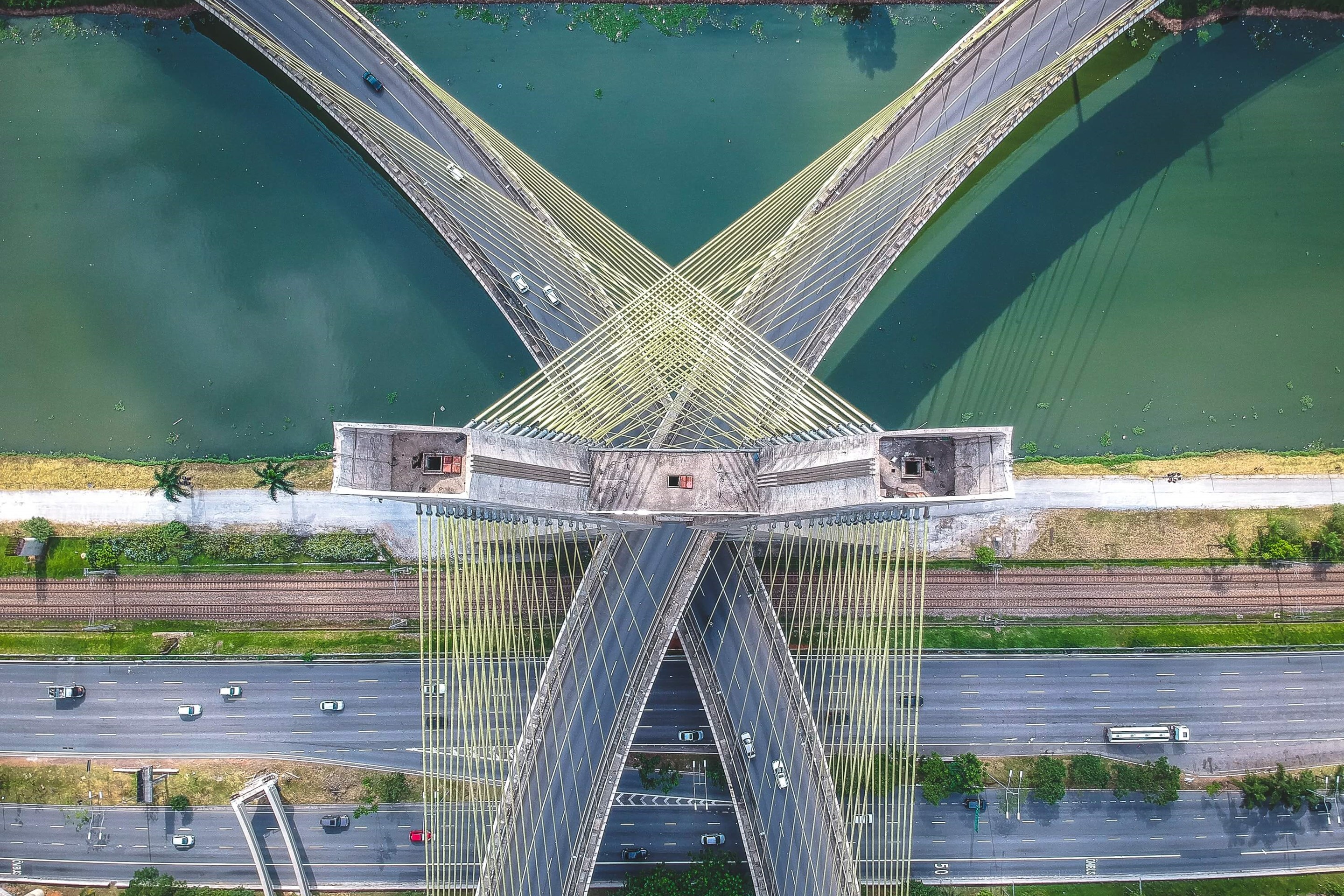 An aerial photo of a criss-crossing bridge that works well as a wallpaper on foldable and dual screen devices
