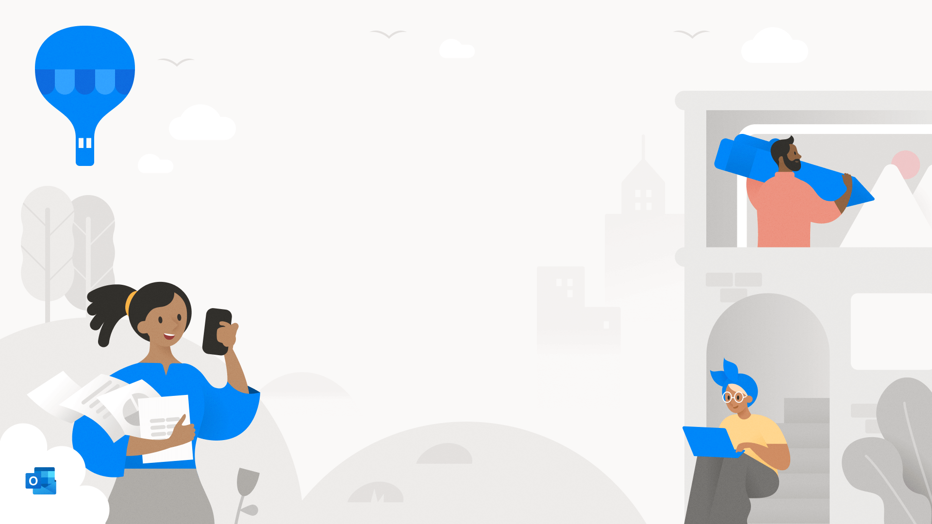 A video chat background from Microsoft, for use within Microsoft Teams, Skype and Zoom, featuring Outlook illustrations
