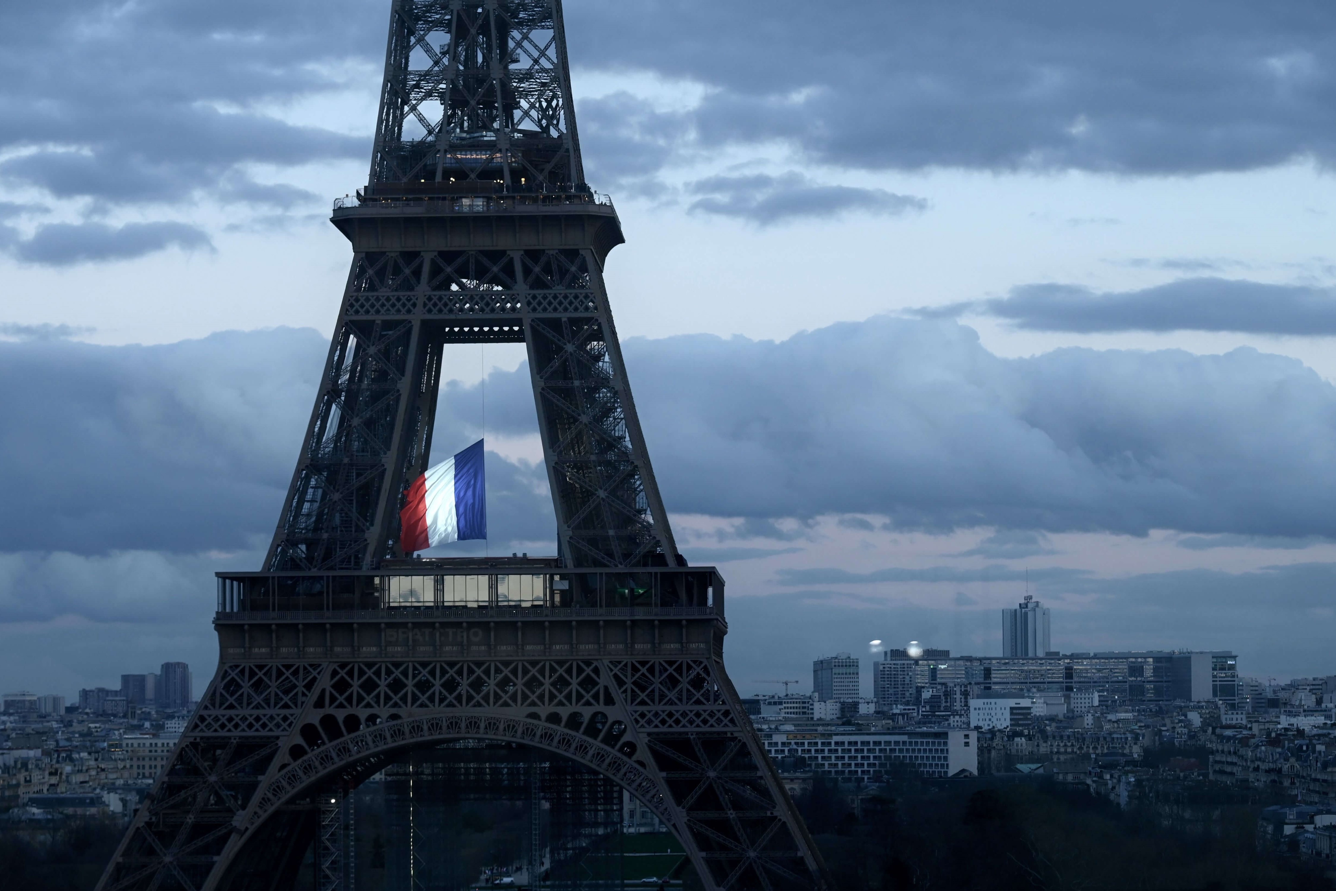 Le drapeau français flottant au centre de la Tour Eiffel, le 11 mars 2020, lors d’une cérémonie pour la première Journée nationale d’hommage aux victimes du terrorisme (© PHILIPPE LOPEZ/POOL/AFP via Getty Images)
