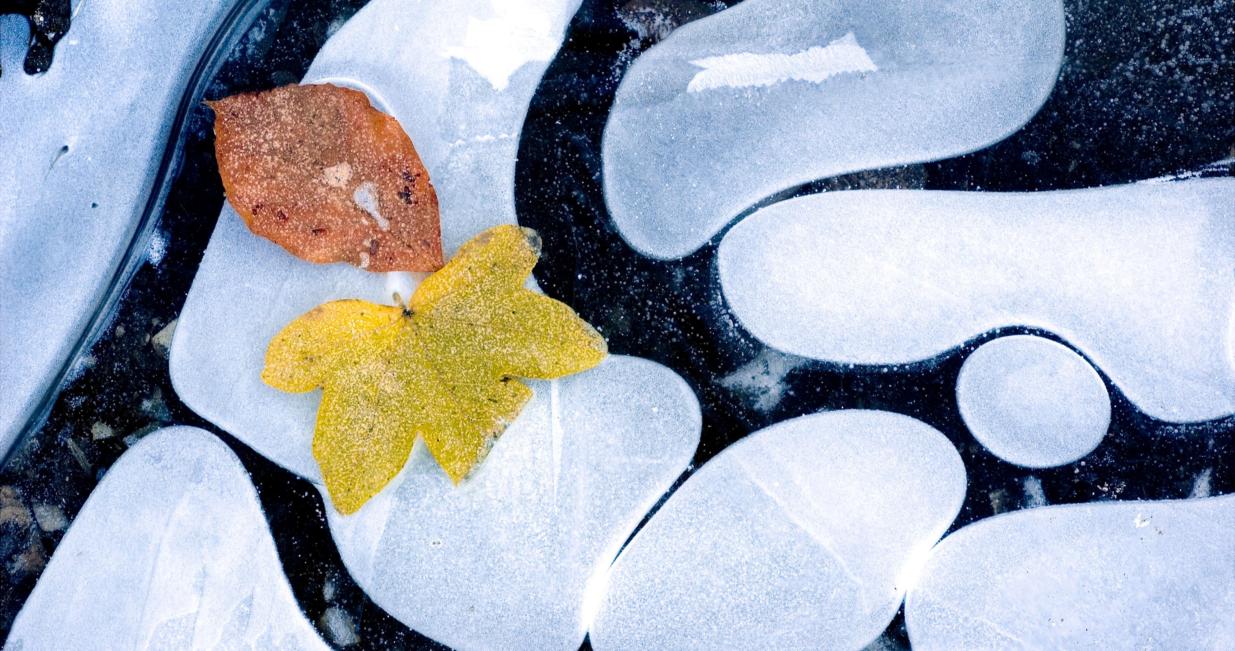 Feuilles d’automne sur de l’eau gelée, France (© Jean-Philippe Delobelle/Minden Pictures)