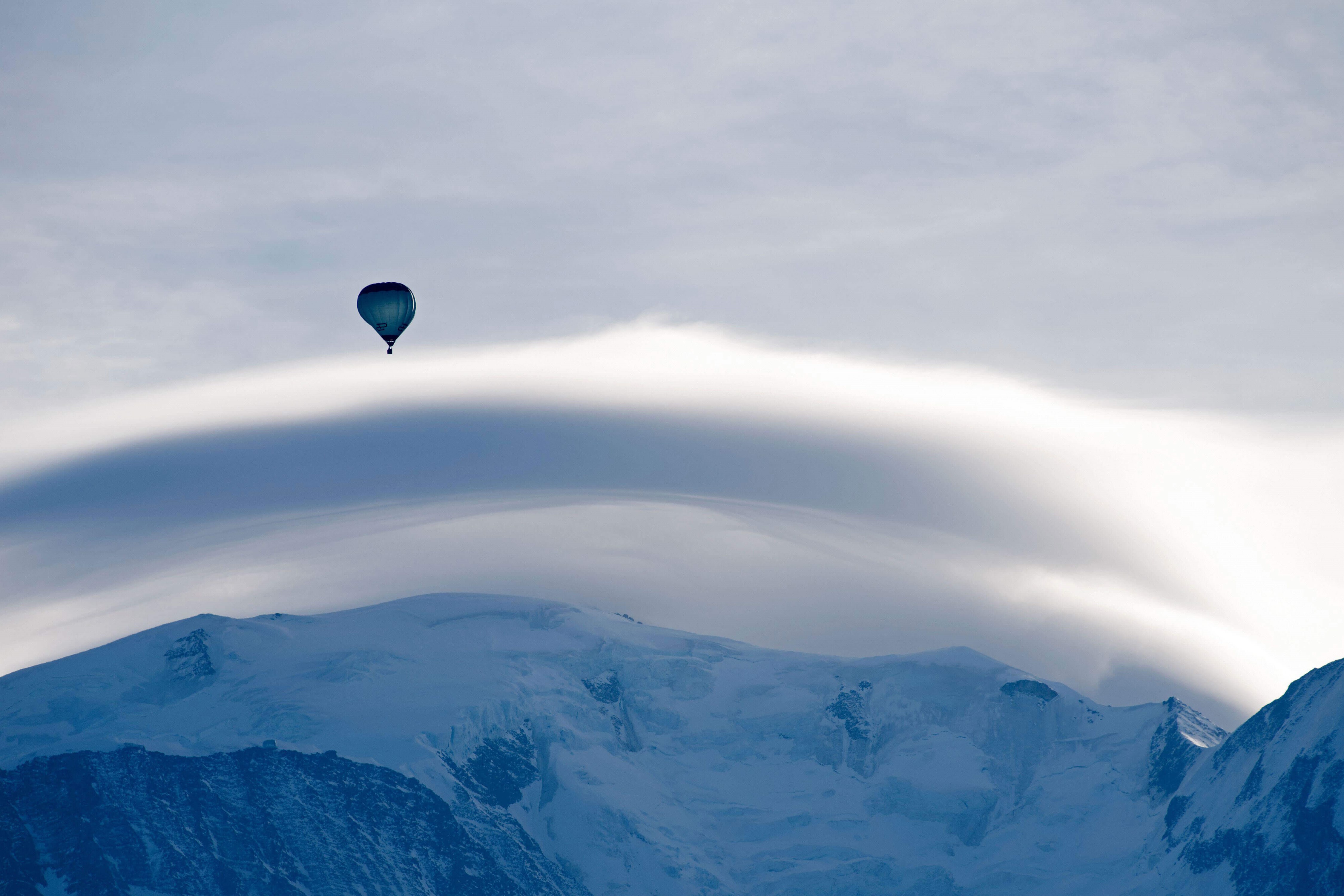 Le Mont Blanc, surmonté d’un nuage lenticulaire et d’une montgolfière, Haute-Savoie (© Henry Ausloos)