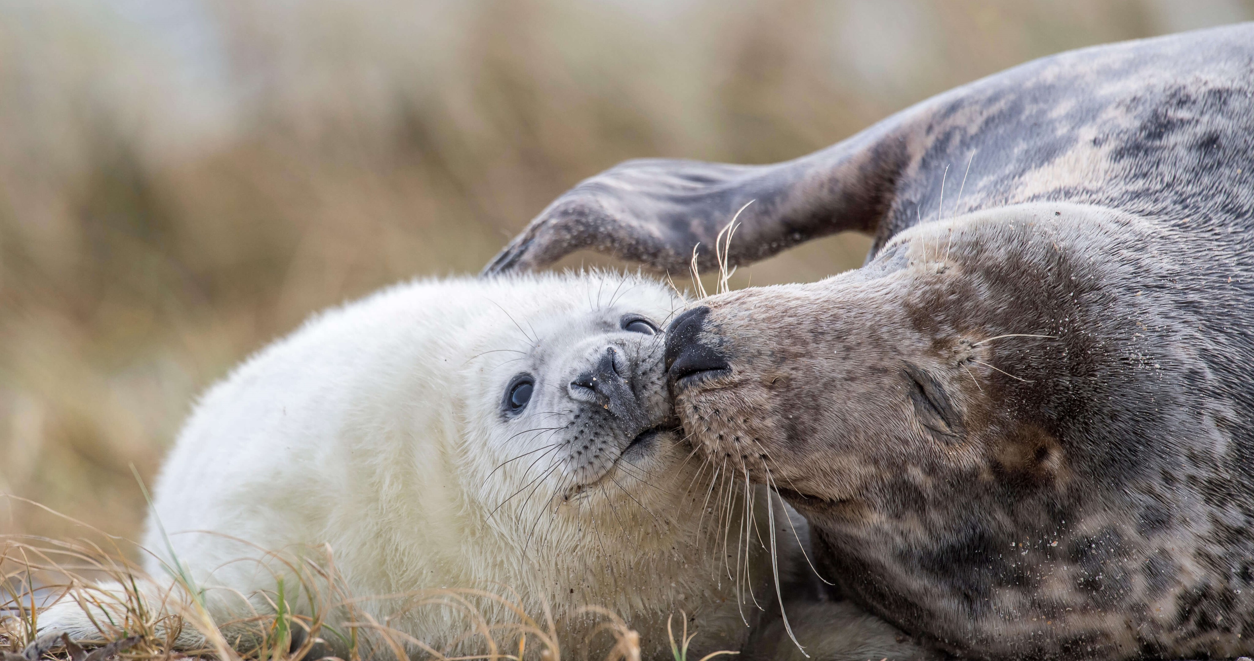 Maman phoque gris et son petit sur une plage d’Heligoland, Schleswig-Holstein, Allemagne (© imageBROKER/Alamy Stock Photo)