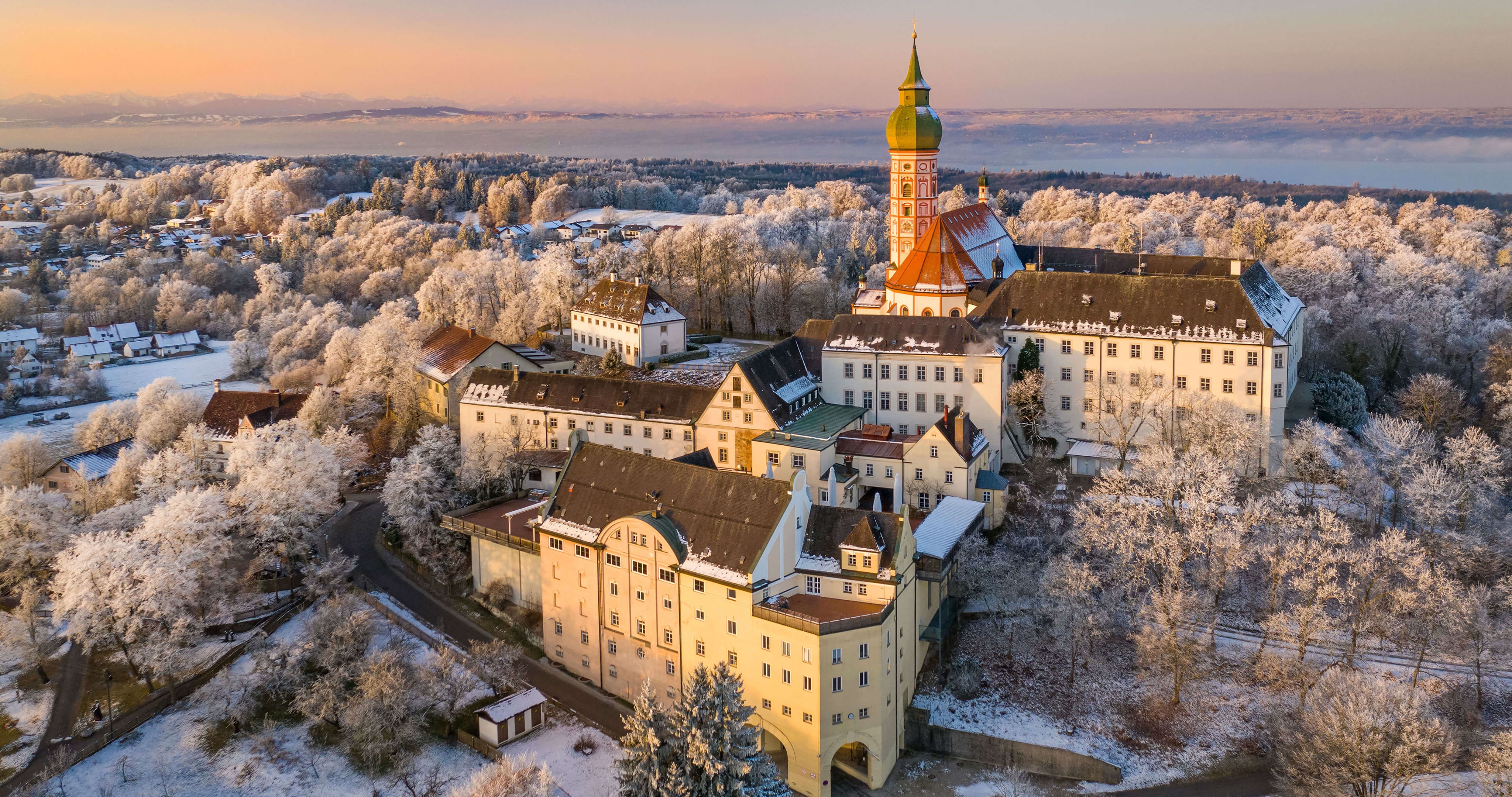 Winterliche Morgenstimmung am Kloster Andechs in Bayern mit Blick auf den Ammersee (© Reinhard Schmid/Huber/eStock Photo)