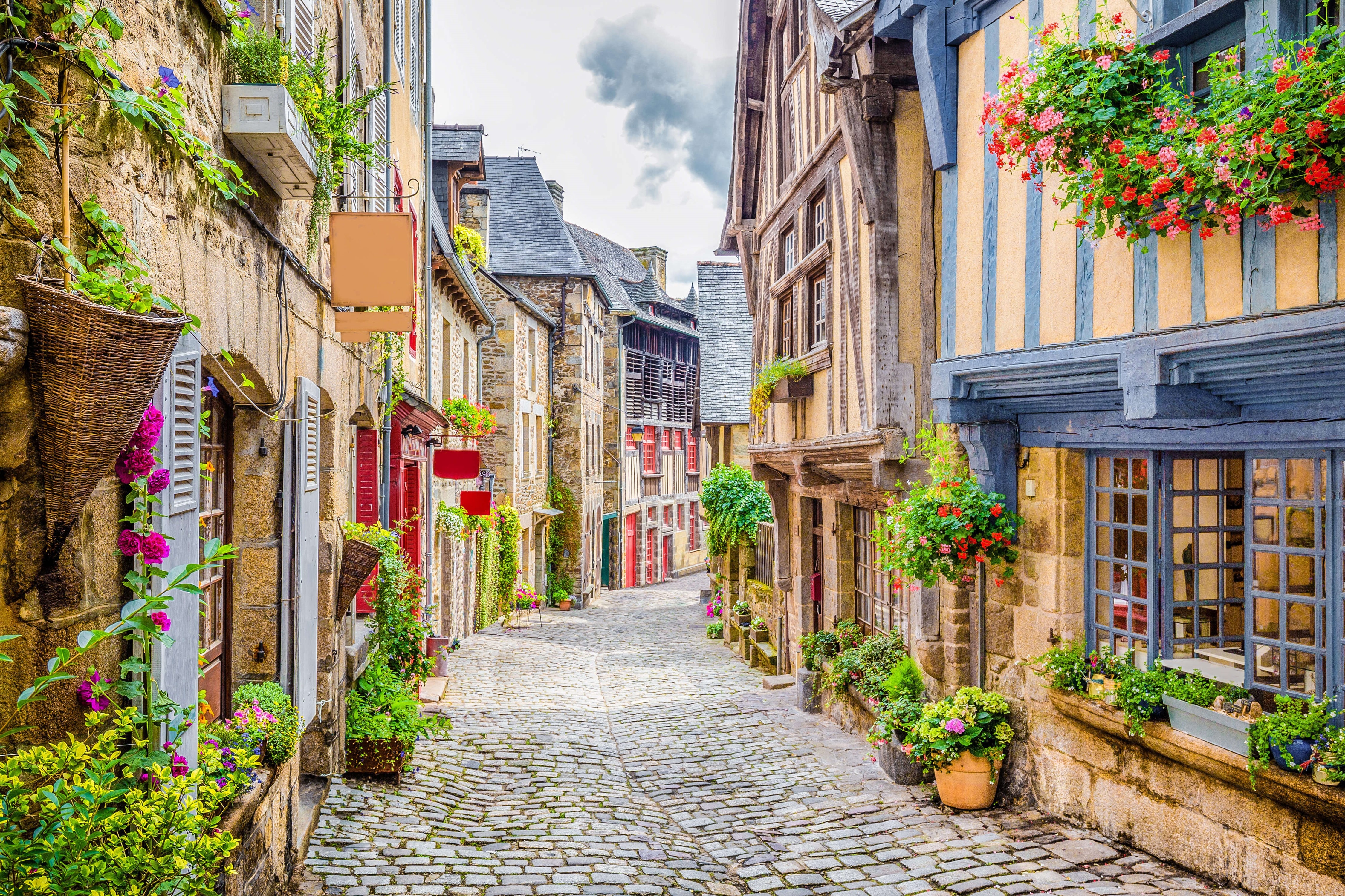 Rue du Petit-Fort et ses jardinières fleuries, Dinan, Côtes-d’Armor, Bretagne (© Scott Wilson/Alamy Stock Photo)