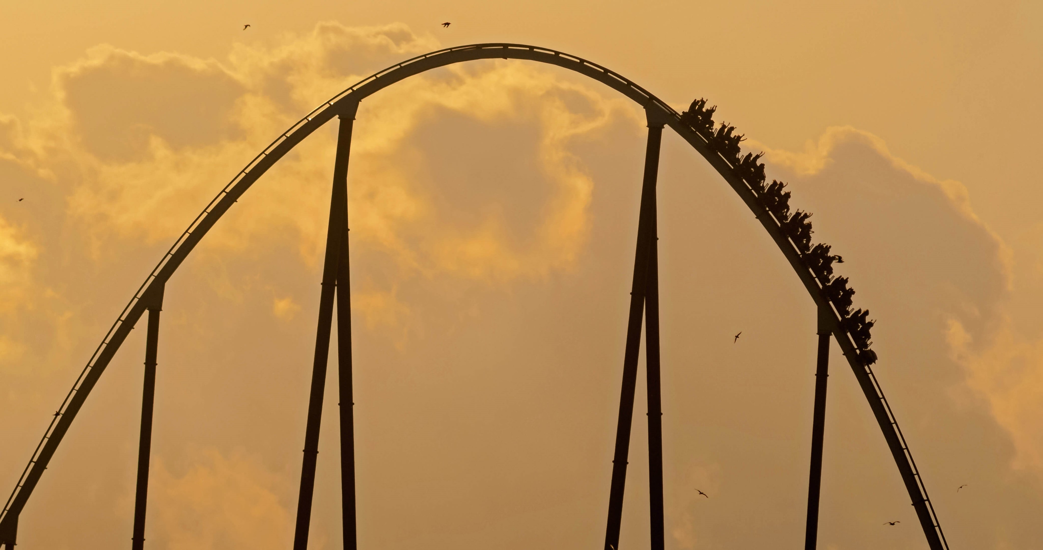 Silhouette of Shambhala roller coaster at sunset in PortAventura Park, Salou, Tarragona, Spain (© Joaquim F. P./Getty Images)