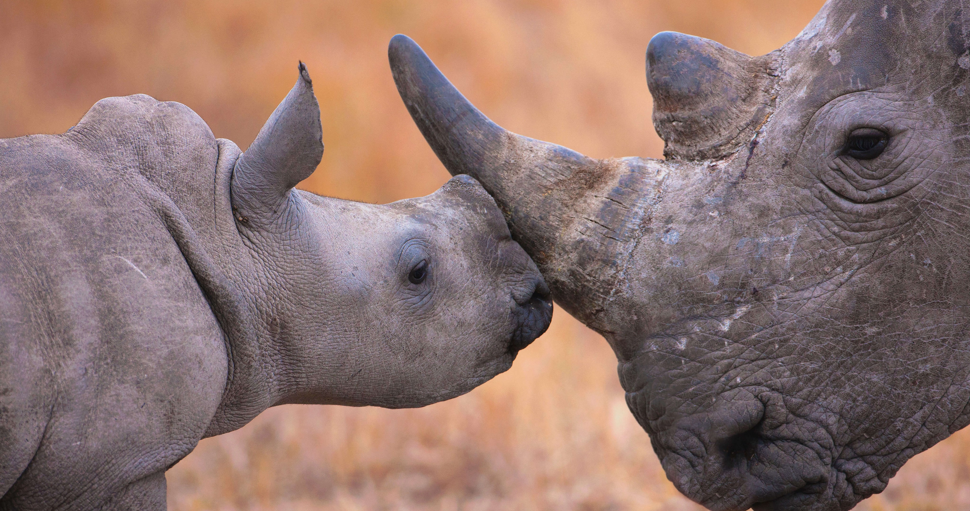 「シュシュルウェイムフォロジ動物保護区のシロサイの親子」南アフリカ (© Martin Harvey/Alamy)